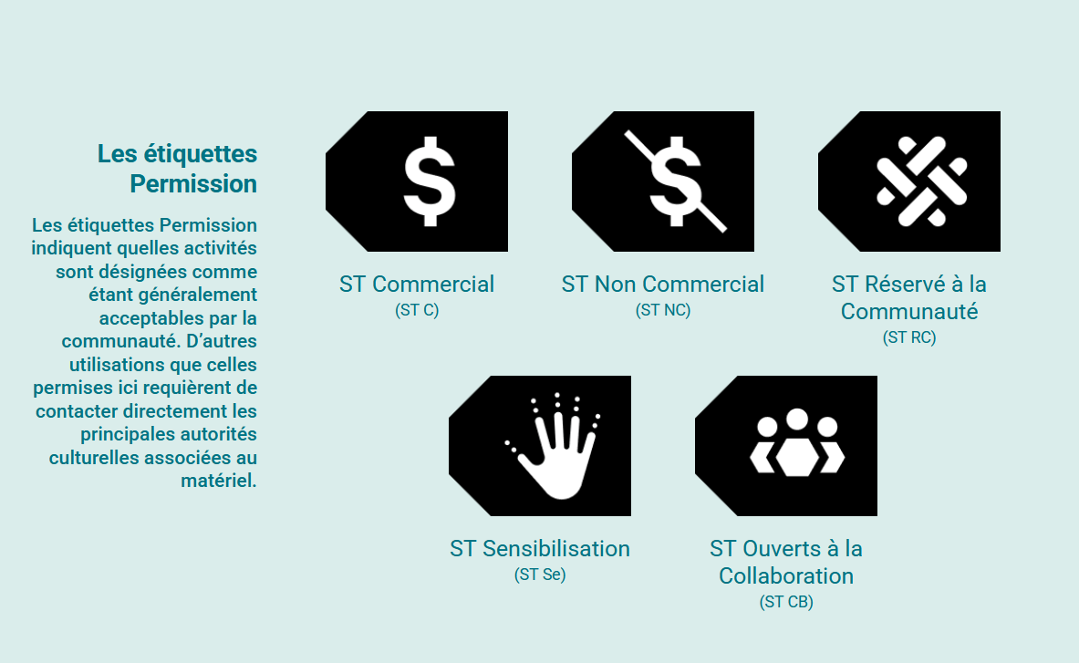 Parmi les grandes catégories d’étiquettes ST, les étiquettes Permission (voir ci-bas) « indiquent quelles activités sont désignées comme étant généralement acceptables par la communauté. » Par exemple, l’étiquette ST Commercial (ST C) est utilisée lorsque l’auteur·trice accepte d’accorder aux utilisateur·trice·s externes la permission d’utiliser son matériel de quelque façon que ce soit, incluant d’en tirer des bénéfices économiques dans le futur. L’étiquette ST Réservé à la Communauté (ST RC) signifie, quant à elle, que le matériel n’est généralement pas diffusé hors de la famille, du clan ou de la communauté.